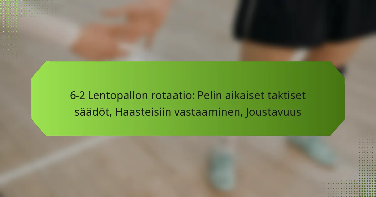 6-2 lentopallon kiertoa käyttävät joukkueet kohtaavat useita haasteita, jotka voivat vaikuttaa suorituskykyyn. Näitä haasteita ovat pelaajien suorituskyvyn hallinta, vastustajien strategioiden torjuminen, loukkaantumisten käsittely ja tehokkaiden vaihtojen varmistaminen. Joustavuus ja taktiset muutokset ovat ratkaisevan tärkeitä näiden esteiden voittamiseksi otteluiden aikana.