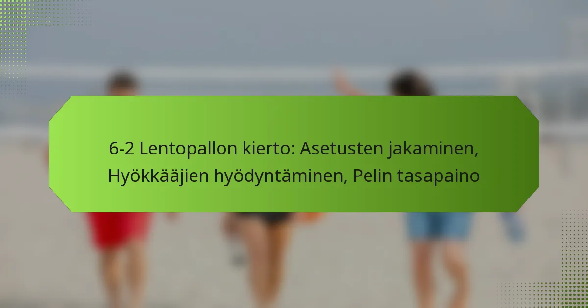 6-2 lentopallokierto on järjestelmä, joka hyödyntää kuutta pelaajaa eturivissä ja kahta syöttäjää, mahdollistaen tasapainoisen hyökkäysstrategian. Tämä kierto parantaa joukkueen kykyä hyökätä samalla säilyttäen puolustuskyvyt, mikä tekee siitä suositun valinnan kilpailupelissä.